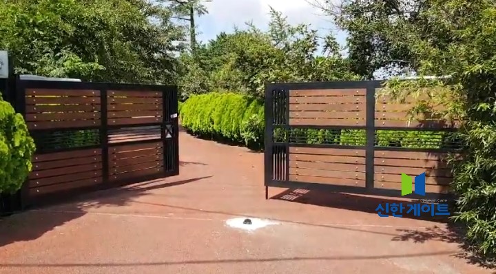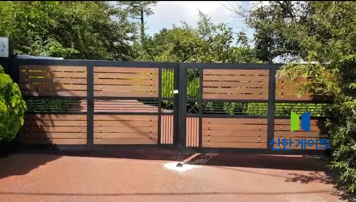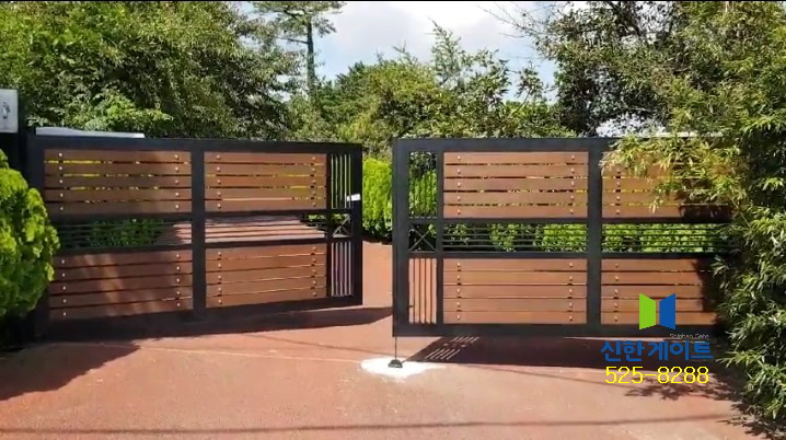 제주도 스윙자동대문 관련링크 목록 본문 제주도 스윙 자동대문 W5260xH2000 기둥:150x150 목재:적삼목 색상:도토리색 다보:실버 후레임:검정 제주도는 바람이 강해서 바람구멍을 내는 디자인 선택. 리모콘방식 이전 다음